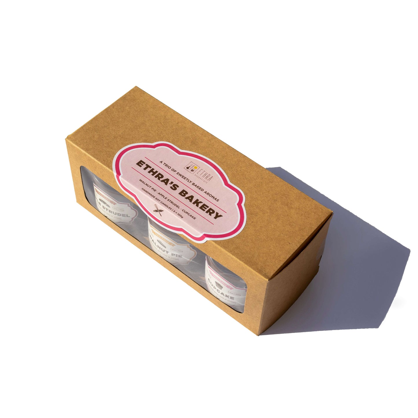 Μέσα του θα βρεις τρεις λαχταριστές δημιουργίες των 100γρ, τρία κεριά σόγιας που μοιάζουν σαν να βγήκαν κατευθείαν από τον φούρνο της Ethra: